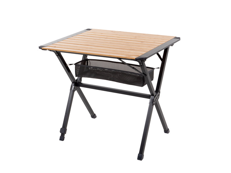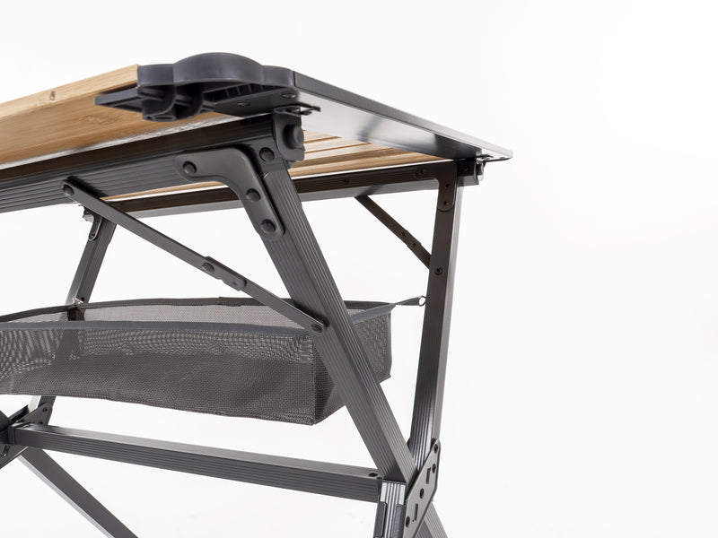 Die Tischplatte aus robustem Bambusholz verleiht dem Tisch nicht nur eine natürliche Optik, sondern ist auch besonders pflegeleicht. Das Gestell aus leichtem Aluminium sorgt für Stabilität bei minimalem Gewicht – ideal für Reisen, Festivals oder spontane Ausflüge ins Grüne.