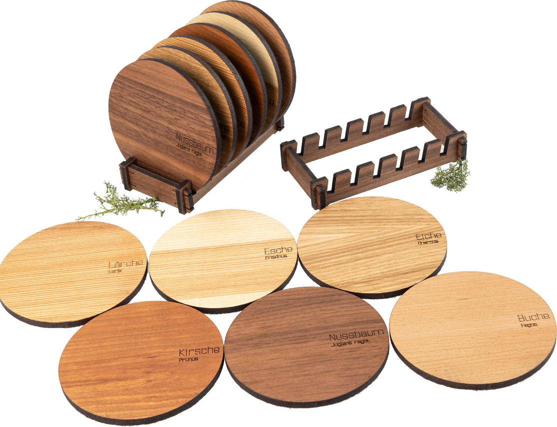 Holz Untersetzer "Baumarten Set" mit Filz Rückseite und Aufsteller bei Waldbursche.de