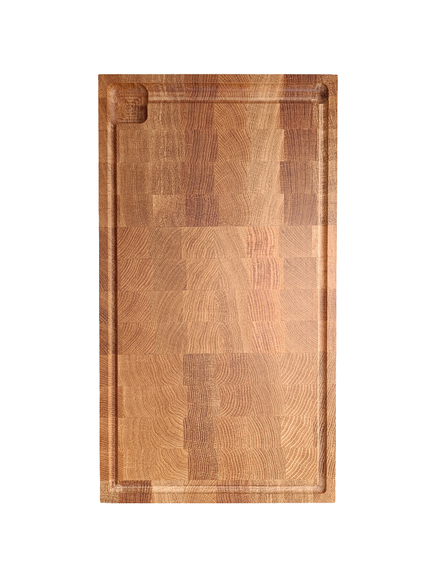 - Besonderheiten: Saftrille, seitliche Griffe, blockverleimt aus Stirnholz