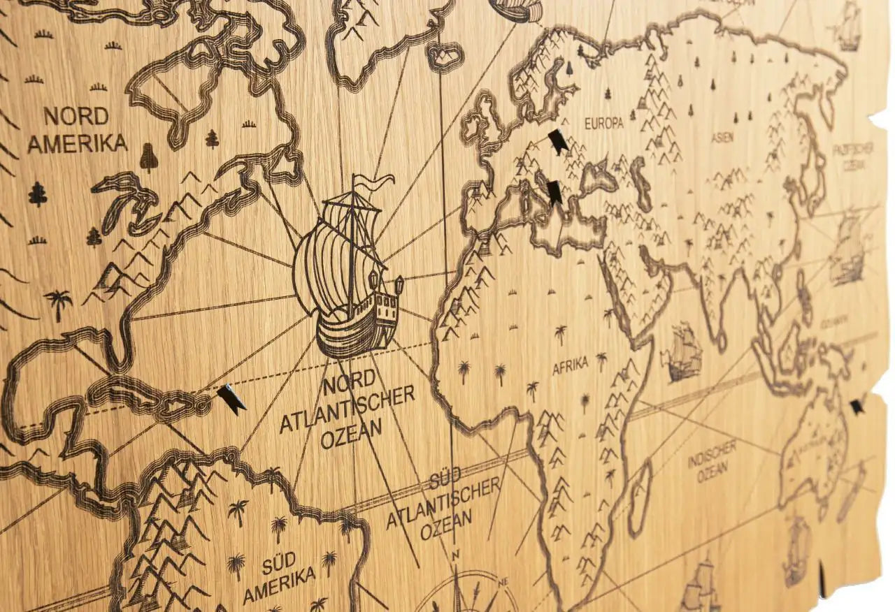 Dank präziser Laserschnitt-Technik und feinster Lasergravur entstehen detailreiche Kontinente, die der Karte einen eleganten Vintage-Charakter verleihen – ganz im Stil klassischer Entdeckerkarten.