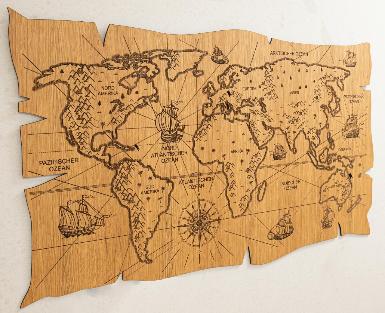 Holz Wandbild „Weltkarte Antik“ – Eiche trifft Entdeckergeist