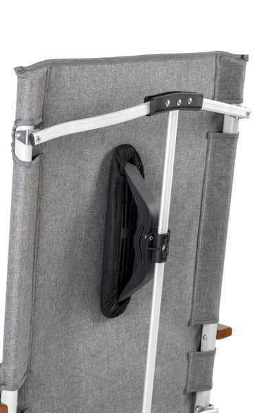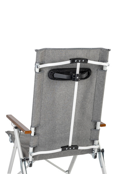 Optisch setzt der Faltstuhl ebenfalls Maßstäbe: Der edle grau-melierte Stoff, kombiniert mit braunen Armlehnen aus dunklem Echtholz und einem stilvollen Leder-Etikett, verleiht dem Stuhl ein exklusives, hochwertiges Design, das sich deutlich von klassischen Campingmöbeln abhebt.