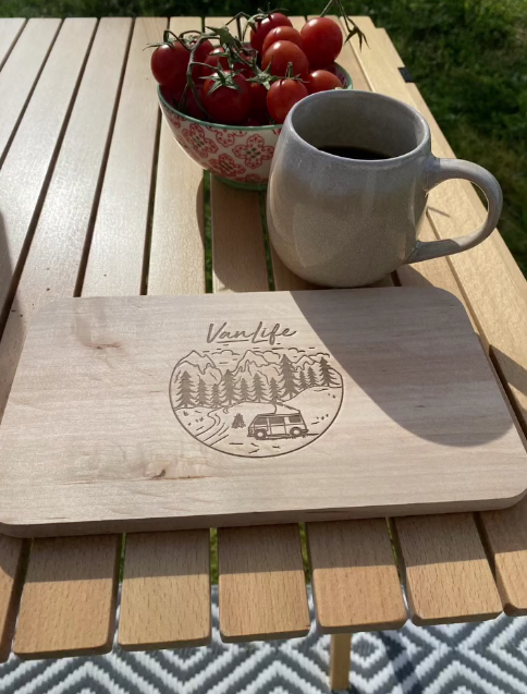 Das Schneidebrett hat eine Größe von 22 x 12 x 1,2 cm und eignet sich perfekt für geringe Platzverhältnisse wie in eurem Van.