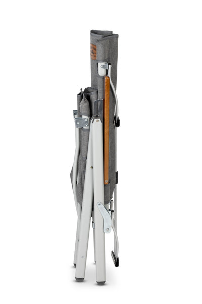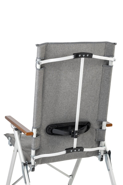 Hopfällstolen sätter även standard visuellt: det eleganta gråmelerade tyget , i kombination med bruna armstöd av mörkt äkta trä och en snygg läderetikett , ger stolen en exklusiv, högkvalitativ design som tydligt sticker ut från klassiska campingmöbler.